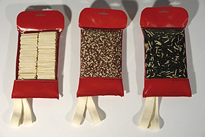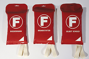 Burnout II | 3 genähte Feuerdecken, (Ansicht Vorne) | 2007 | je 13 x 30 cm (Dreier Set) | Huth & Frey