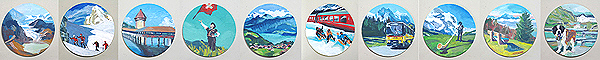 Bierdeckel Collection «Nostalgische Schweiz» | Digitalprints (von Ölmalereien auf runde Bierdeckel) auf runde Bierdeckel appliziert | 2007 | 10 x runde Bierdeckel 10 cm Durchmesser | Muriel Stern