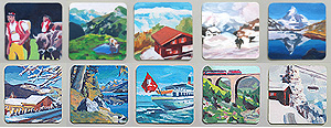 Bierdeckel Collection «Nostalgische Schweiz» | Digitalprints (von Ölmalereien auf eckige Bierdeckel) auf eckige Bierdeckel appliziert | 2007 | 10 x eckige Bierdeckel 9 cm x 9 cm | Muriel Stern